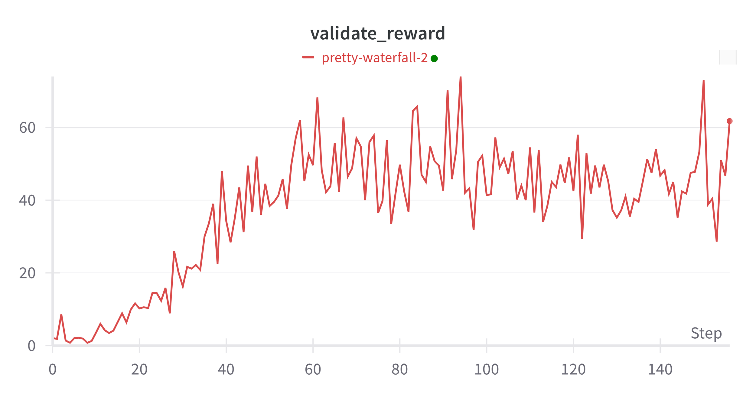 Improvements start to plateau from around 70 epochs (about 3.5 Million frames), the validation rewards which are an average taken over a 5 minute period get very noisy from around 40 epochs.