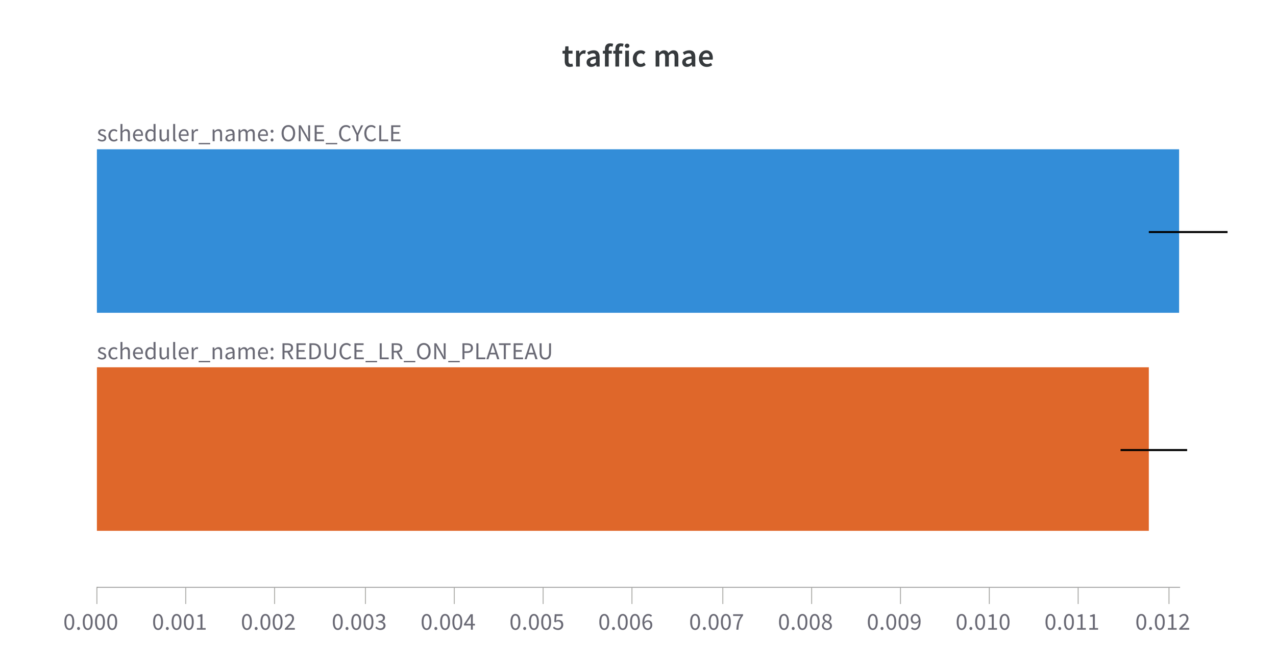 So, here we are looking at the Mean Absolute Error (MAE) for each of the datasets trained with the modified model which contains only lag features and uses a slightly modified scaling function. The results are with my usual 5 runs with different seeds and I am showing both the mean and the error bars are the std error to show the level of variation between the 5 runs. With the exception of Traffic where performance with 1Cycle is marginally inferior to the ReduceLROnPlateau we see an improvement when using 1Cycle. Not only do we see the obvious reduction in MAE when using 1Cycle, but we also see a reduction in the variation between the 5 runs. In other words we are getting more consistent results using 1Cycle. All the results are available on the fantastic wandb platform.